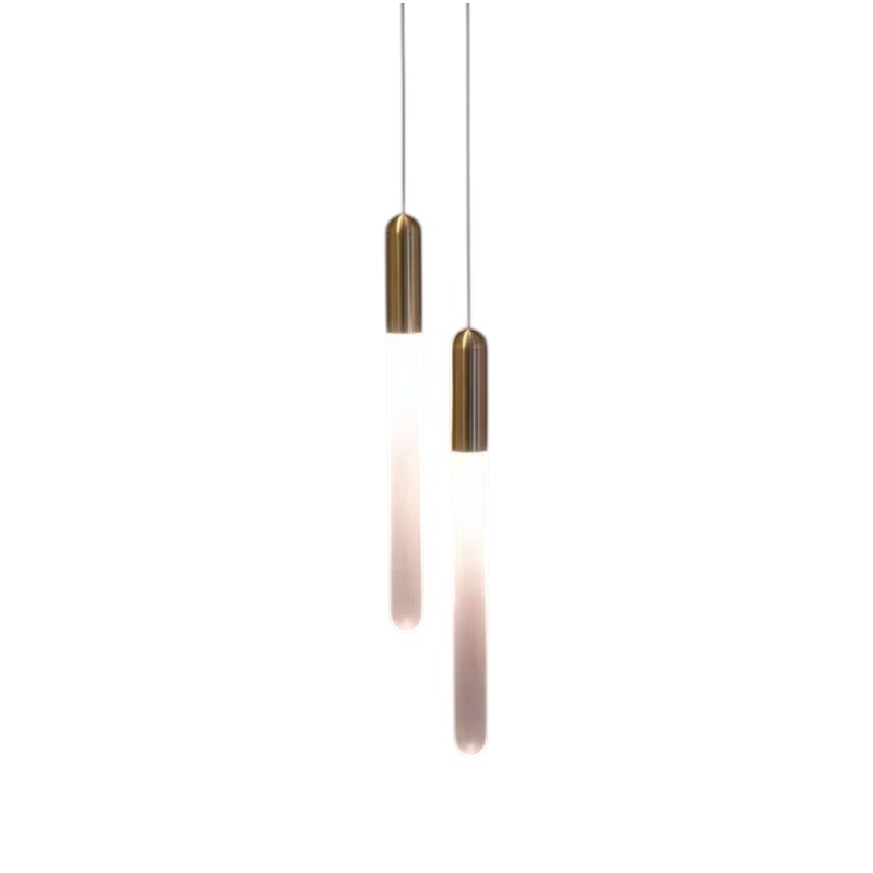 Подвесной светильник ARTI by Romatti — воплощение минимализма и элегантности в современном дизайне. Конструкция состоит из двух удлинённых цилиндрических плафонов с матовой поверхностью, увенчанных лаконичными металлическими элементами золотистого оттенка. Светильник подвешен на тонких шнурах, что создаёт ощущение лёгкости и невесомости. Чистые линии и отсутствие лишнего декора подчёркивают его универсальность и утончённость, а мягкое рассеянное освещение добавляет уюта любому пространству.