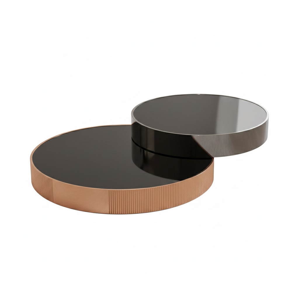 Наложение форм и умелое сочетание роскошных материалов - вот отличительные черты BENSON by Romatti. Оригинальный и функциональный журнальный столик - две столешницы соединены друг с другом, при этом верхняя свободно вращается, легко можно менять ее положение. Великолепная отделка создает многогранность и глубину.