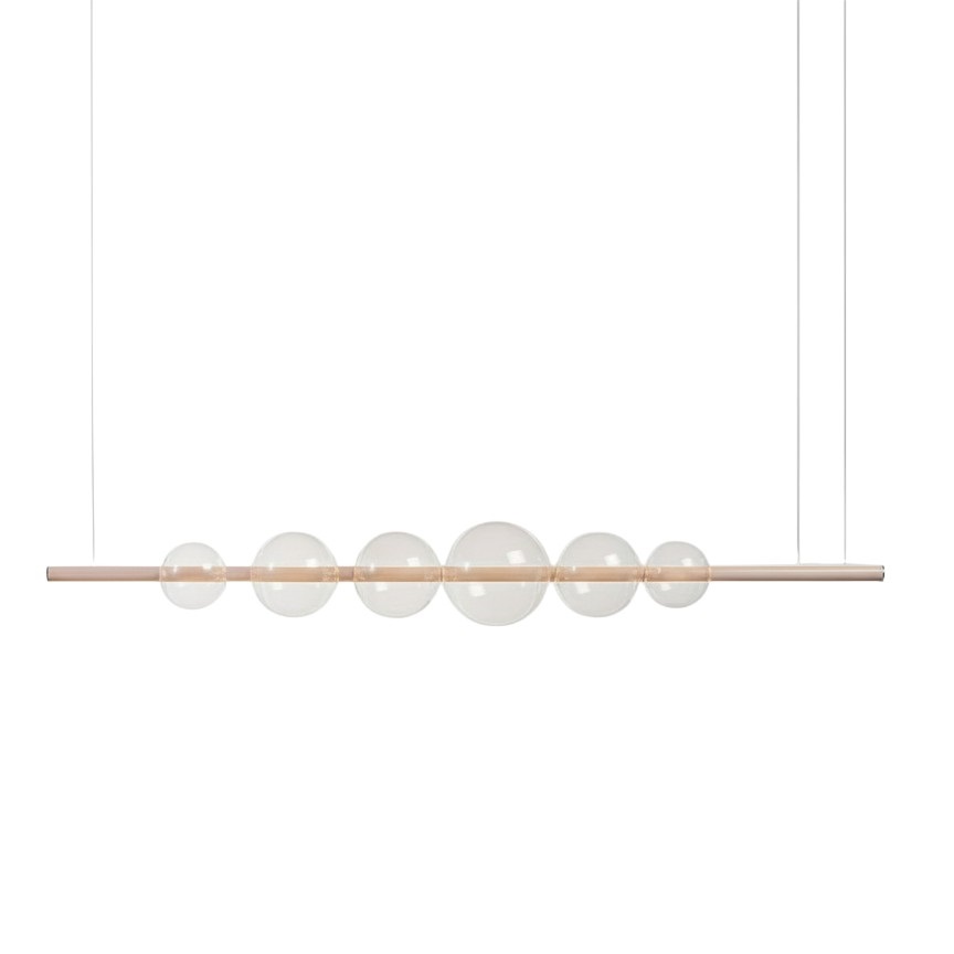 Композиция из идеально гладких стеклянных сфер, нанизанных на тонкую, изящную основу. Люстра словно парит в воздухе, наполняя комнату мягким, рассеянным светом.