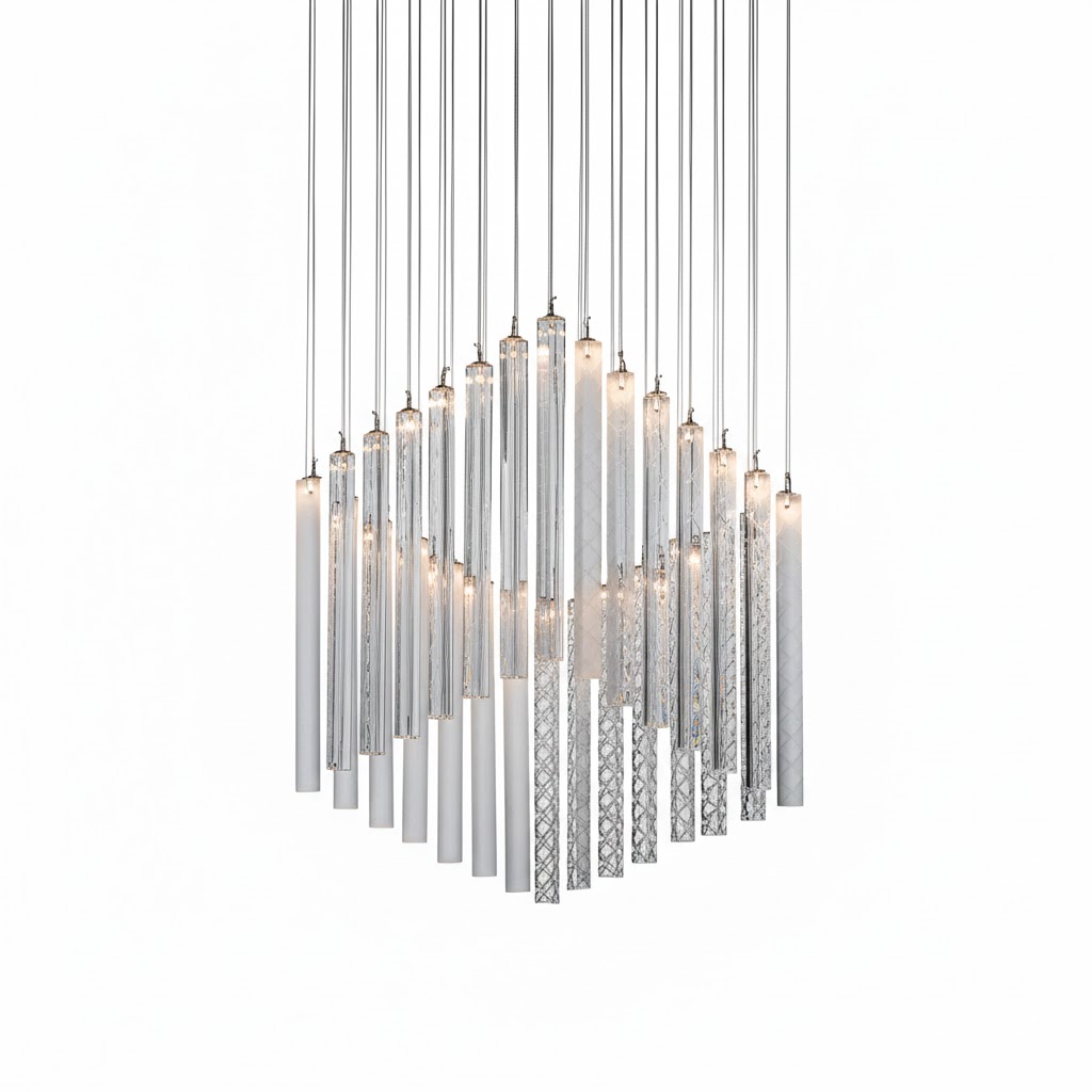 Уникальная фактура: Стержни выполнены из высококачественного хрусталя с различными типами обработки — от идеально гладких поверхностей до изысканной алмазной гравировки и матового напыления. Это создает сложную игру преломлений и мягкое, многослойное свечение.