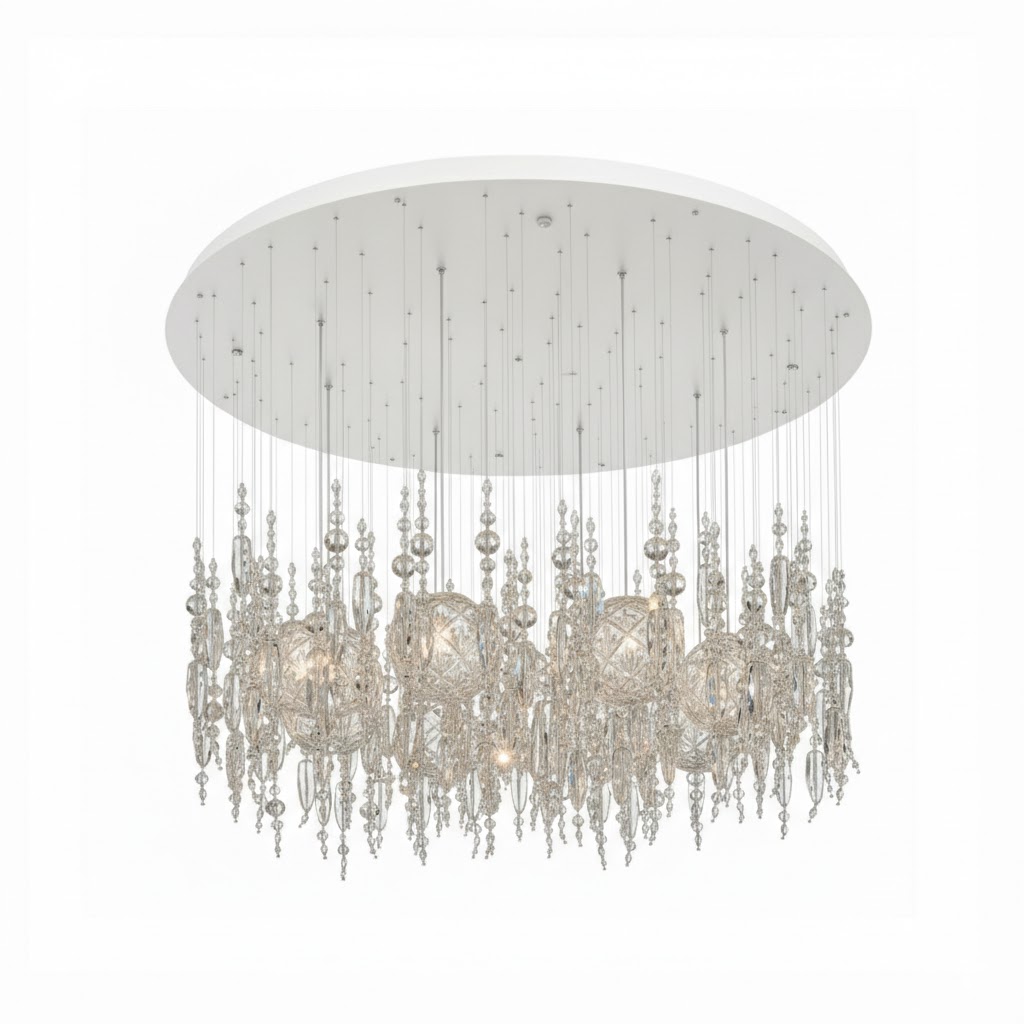Люстра ONTARES by Romatti — воплощение роскоши и утончённого дизайна в современном исполнении. Её конструкция напоминает каскад хрустальных нитей, изящно свисающих с круглой потолочной базы. Множество подвесных элементов разной формы и размера создают завораживающий эффект «дождя» из сверкающих кристаллов, преломляющих свет и наполняющих пространство игрой бликов. Чистые линии и прозрачная фактура делают люстру одновременно элегантной и воздушной.