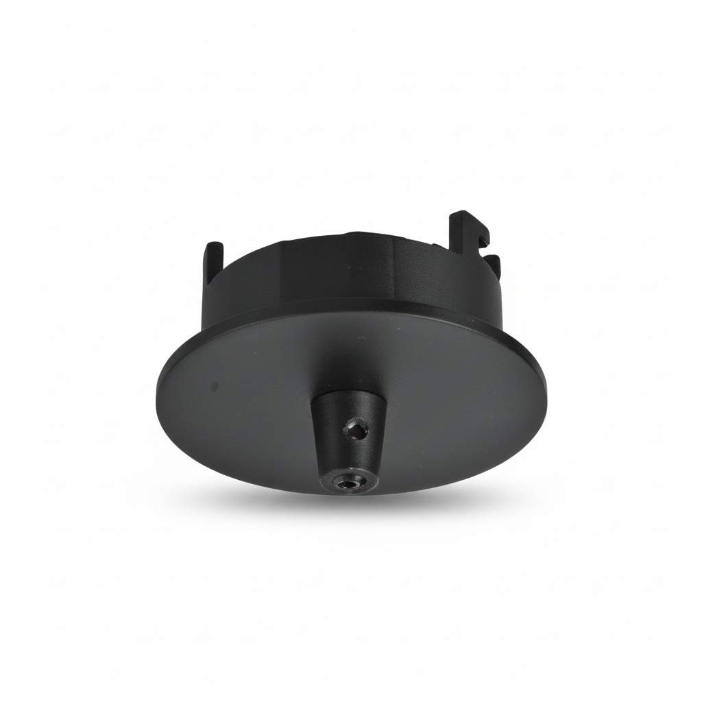 Конструкция кронштейна отличается продуманностью: компактный круглый корпус не перегружает интерьер, а прочный металлический сплав обеспечивает долговечность и устойчивость к нагрузкам. Центральный крепёжный штырь служит основой для фиксации на шинопроводе, гарантируя стабильность положения светильника. Боковые фиксаторы (зацепы) позволяют установить кронштейн без дополнительных инструментов — это существенно экономит время монтажа и упрощает обслуживание системы.