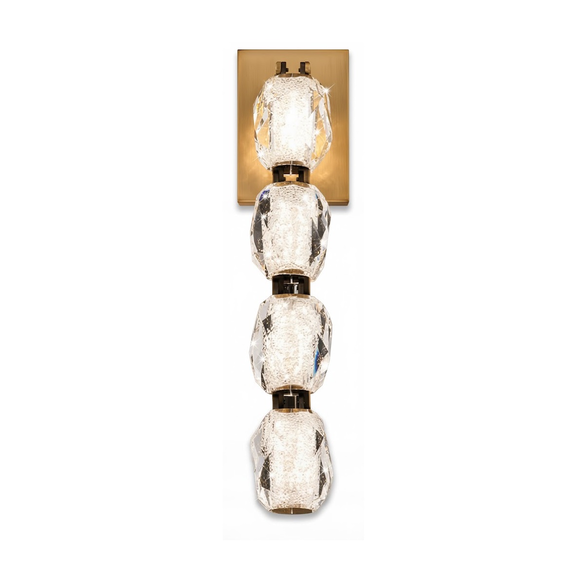 Этот настенный светильник представляет собой изысканное сочетание классической роскоши и современного ювелирного искусства. Изготовленная из высококачественного художественного хрусталя, он притягивает взгляд своей уникальной фактурой, напоминающей застывшие капли воды или драгоценные камни в огранке.
