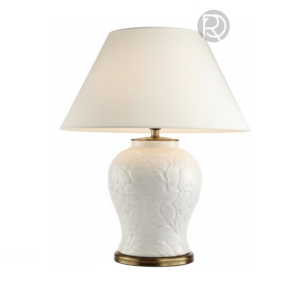 Основание в форме изящной вазы выполнено из белой керамики. Главная особенность – рельефный, объемный узор в виде растительного орнамента. Монохромный белый цвет и четкая фактура придают лампе изысканный, современный вид.