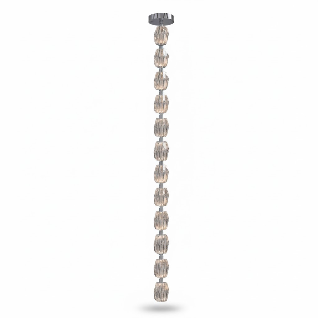 Этот потолочный светильник представляет собой изысканное сочетание классической роскоши и современного ювелирного искусства. Изготовленная из высококачественного художественного хрусталя, он притягивает взгляд своей уникальной фактурой, напоминающей застывшие капли воды или драгоценные камни в огранке.