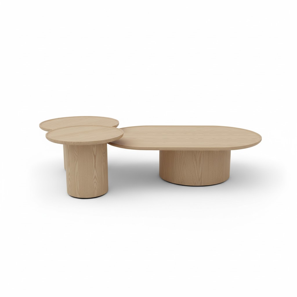 Органичный Дизайн: Набор сочетает в себе плавные, округлые формы, создавая скульптурную композицию в центре гостиной. Столики разной высоты и формы (круглые и овальные) выглядят гармонично как вместе (композиция 140x75x35 см), так и по отдельности.