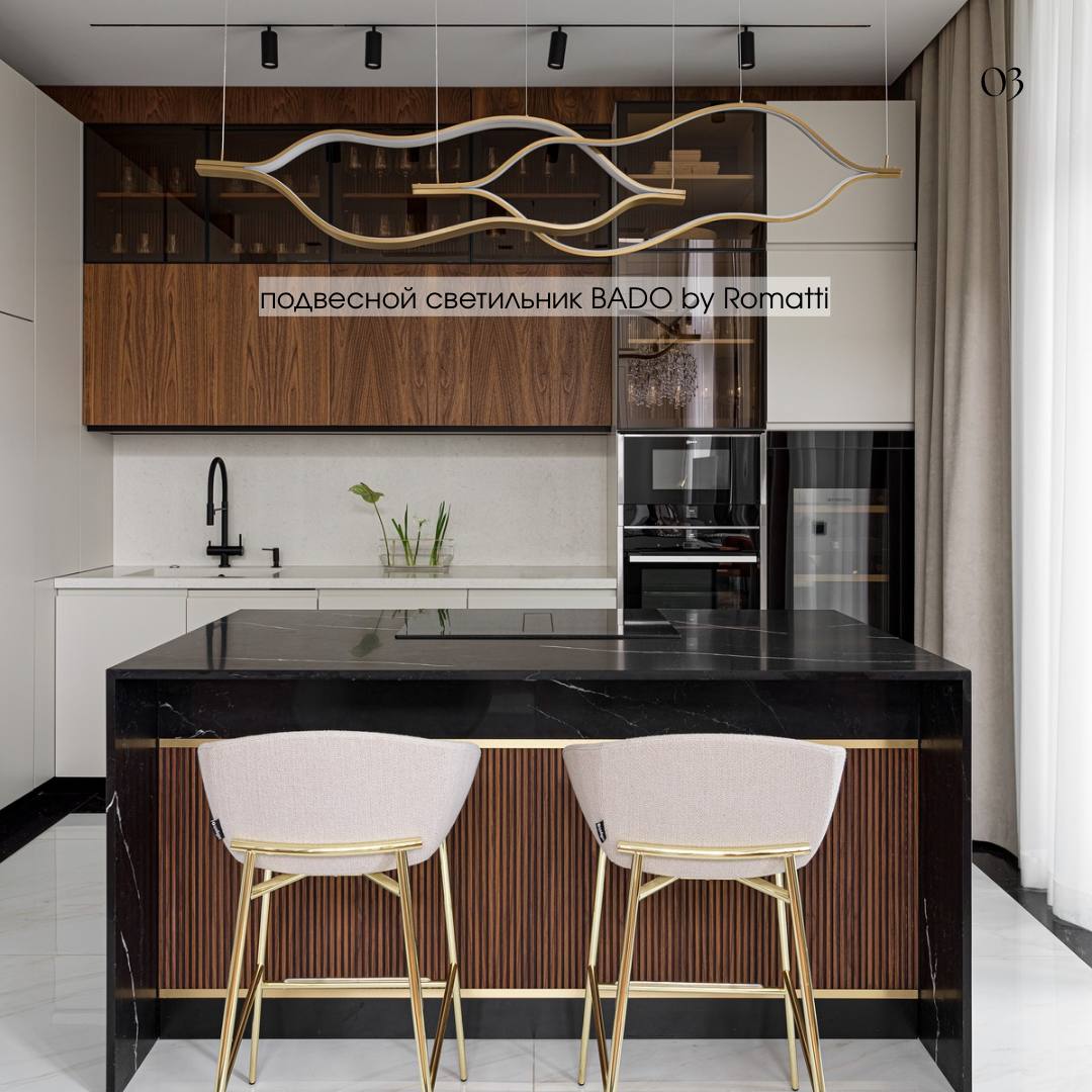 2️⃣ Подвесной светильник BADO by Romatti в индивидуальном исполнении и стулья Calligaris прямиком из Италии.