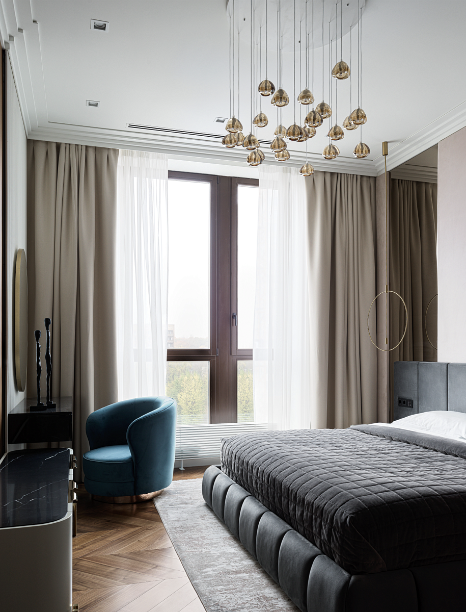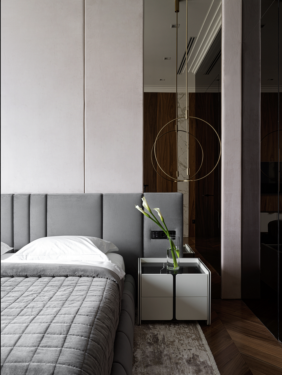 В спальне акцент сделан на свете и текстурах: